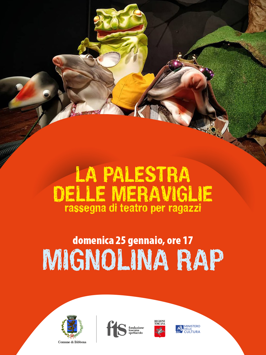“Mignolina rap” è il primo titolo in programma de La Palestra delle Meraviglie, la rassegna di teatro per bambini, ragazzi e famiglie, promossa dal Comune di Bibbona in collaborazione con Fondazione Toscana Spettacolo al teatro La Palestra: uno spettacolo fatto di canzoni, musica e tanti meravigliosi pupazzi in gommapiuma che animeranno questa divertente versione della Mignolina di H. C. Andersen. Con Serena Cercignano e Marta Paganelli, scenografie e pupazzi Federico Biancalani, tecnica Angelo Italiano e Marco Sacchetti, adattamento teatrale e regia di Enrico Falaschi, produzione Teatrino dei Fondi