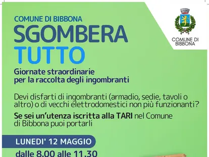 Lunedì 12 maggio in piazza delle Orchidee a Marina di Bibbona e lunedì 26 maggio in piazza Belvedere a Bibbona è in programma lo Sgomberatutto, due…