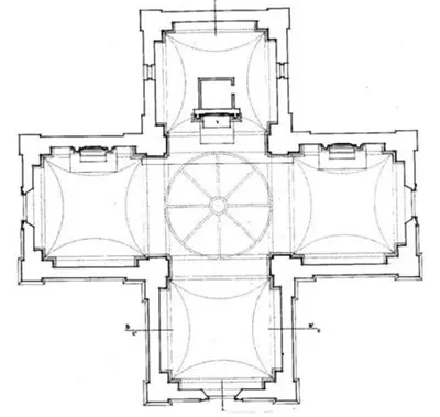 La cupola, posta all'incrocio dei quattro bracci, funge da fulcro unificante dell'intera costruzione e si erge su un piccolo tamburo scandito da otto opuli ed è divisa in sei costoloni. Da notare anche la crociera, scandita da quattro pilastri addossati alle pareti; al termine dei pennacchi sono presenti valve di conchiglia inscritte dentro un serto (una ghirlanda di elementi intrecciati).