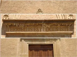 La chiesa presenta inoltre tre portali di medesima declinazione strutturale e ornamentale, rispettivamente situati nei bracci sud-est e ovest dell'edificio. Sugli architravi delle porte sono presenti alcune scritte in latino: sulla principale si legge Terribilis est locus iste ets (in italiano: "Terribile è questo luogo"); sulle altre due invece si legge Hanc est domus Dei porta Coeli ets (in italiano: "Questa è la casa di Dio e la porta del Cielo") e Domus est pietatis et gratiae ets (in italiano: "Questa è la casa della pietà e della grazia).